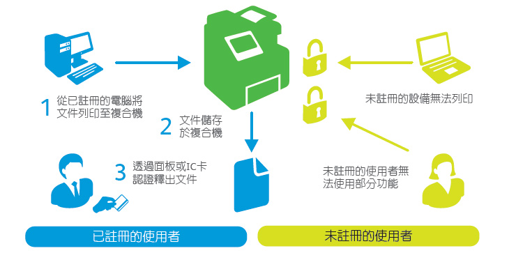 • 使用者認證管理 內(nèi)建權(quán)限控管功能可管理至多1000名使用者,文件送出後可先暫存於複合機硬碟中,直至文件所有者於機器上輸入密碼才進行列印。亦可透過原廠內(nèi)嵌式(選購)或外接式讀卡機(選購)進行身份認證,對各使用者可用功能及彩色輸出等權(quán)限進行管制。
