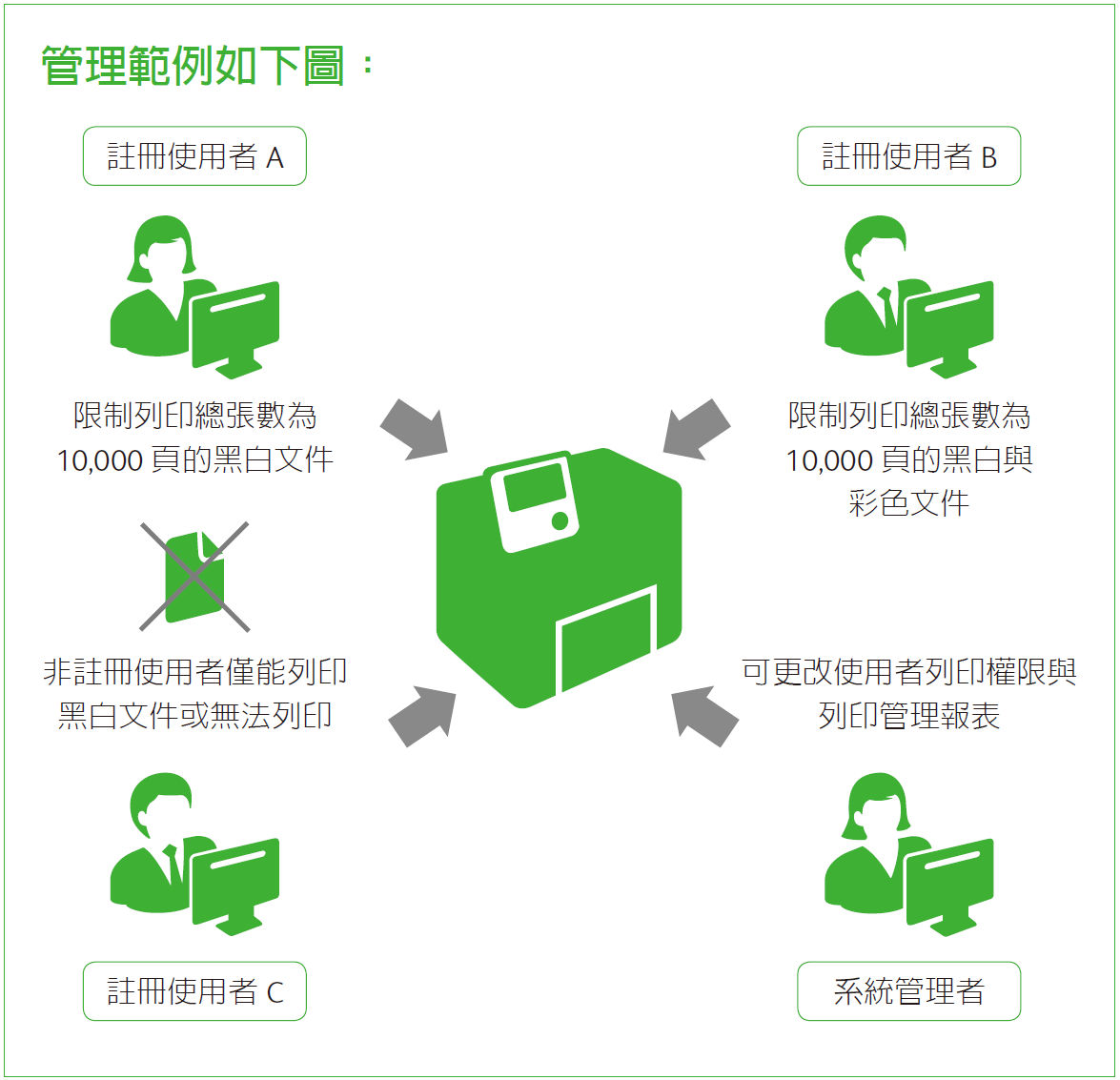 使用XSA (Xerox® Standard Accounting) 設(shè)定個(gè)別使用者的黑白/ 彩色列印權(quán)限,不僅能掌控個(gè)別印量資料外,還能進(jìn)一步追蹤印 表機(jī)的使用者,確保資料安全性。
